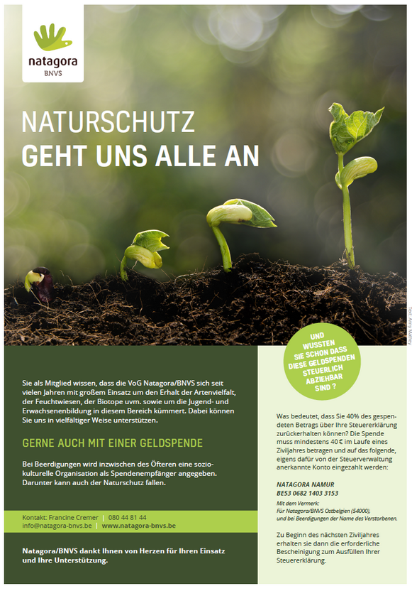 ICH WERDE MITGLIEDMITMACHENIhre Spenden ermöglichen alle Aktionen von Natagora Ostbelgien zugunsten der Artenvielfalt. Steuerliche Absetzbarkeit ab 40 € Spenden pro Jahr.